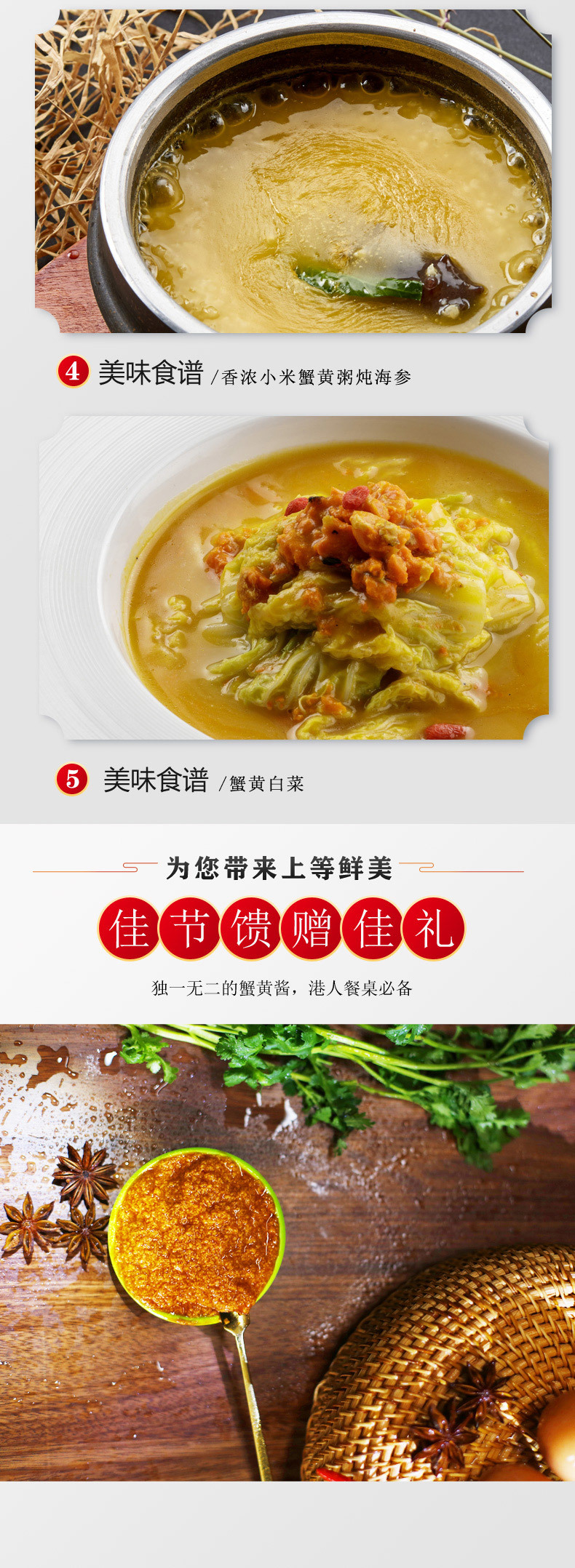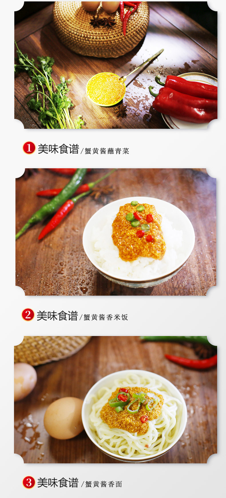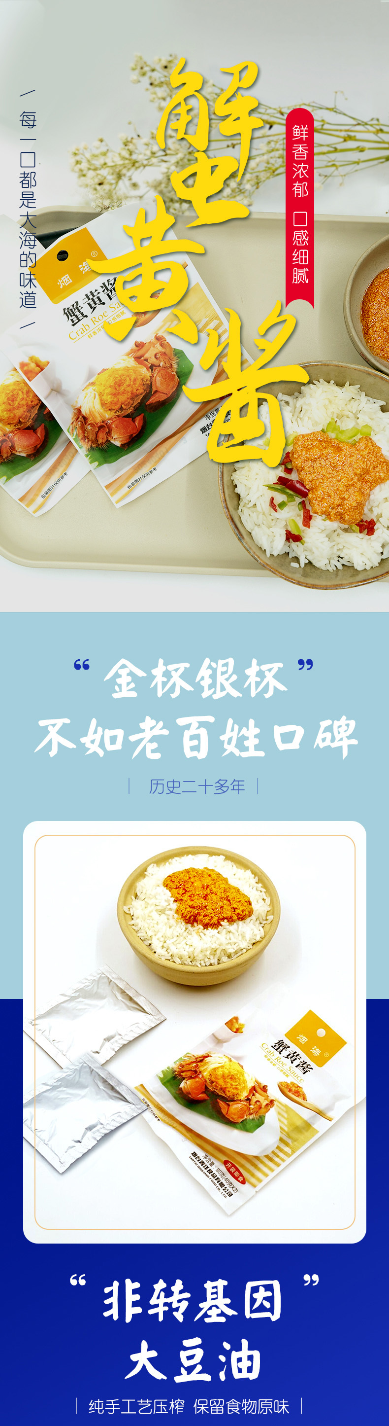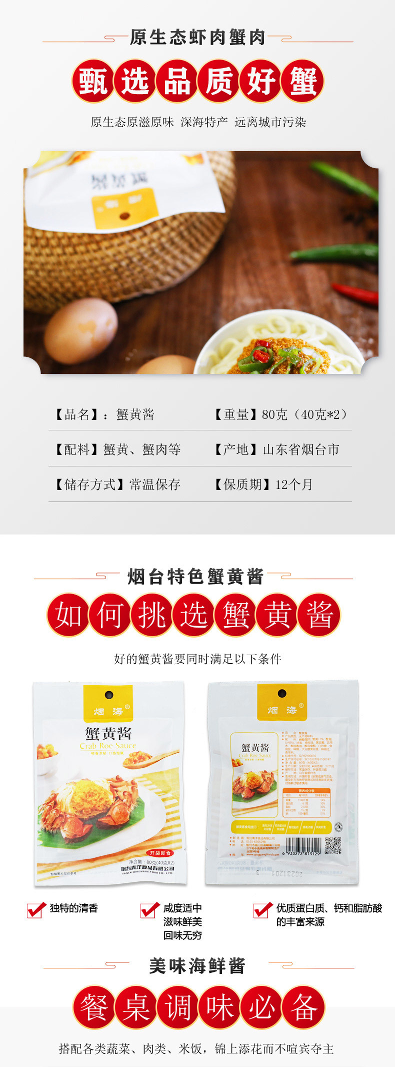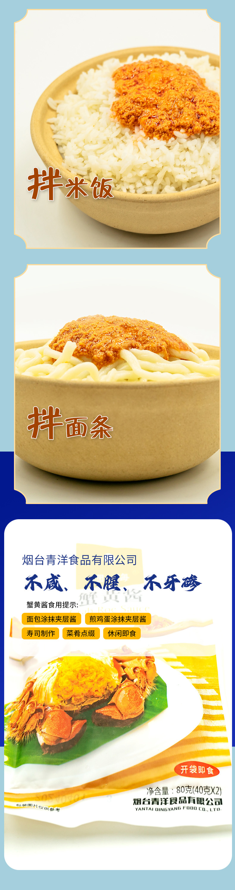 產品名稱:蟹黃醬<br> 數量+價格:80g * 10袋 49.90元<br> 80g * 20袋 95.90元<br> 80g * 40袋 180元<br>